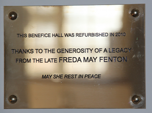 "This Benefice Hall was refurbished in 2010 thanks to the generosity of a legacy from the late Freda May Fenton. May she rest in Peace."